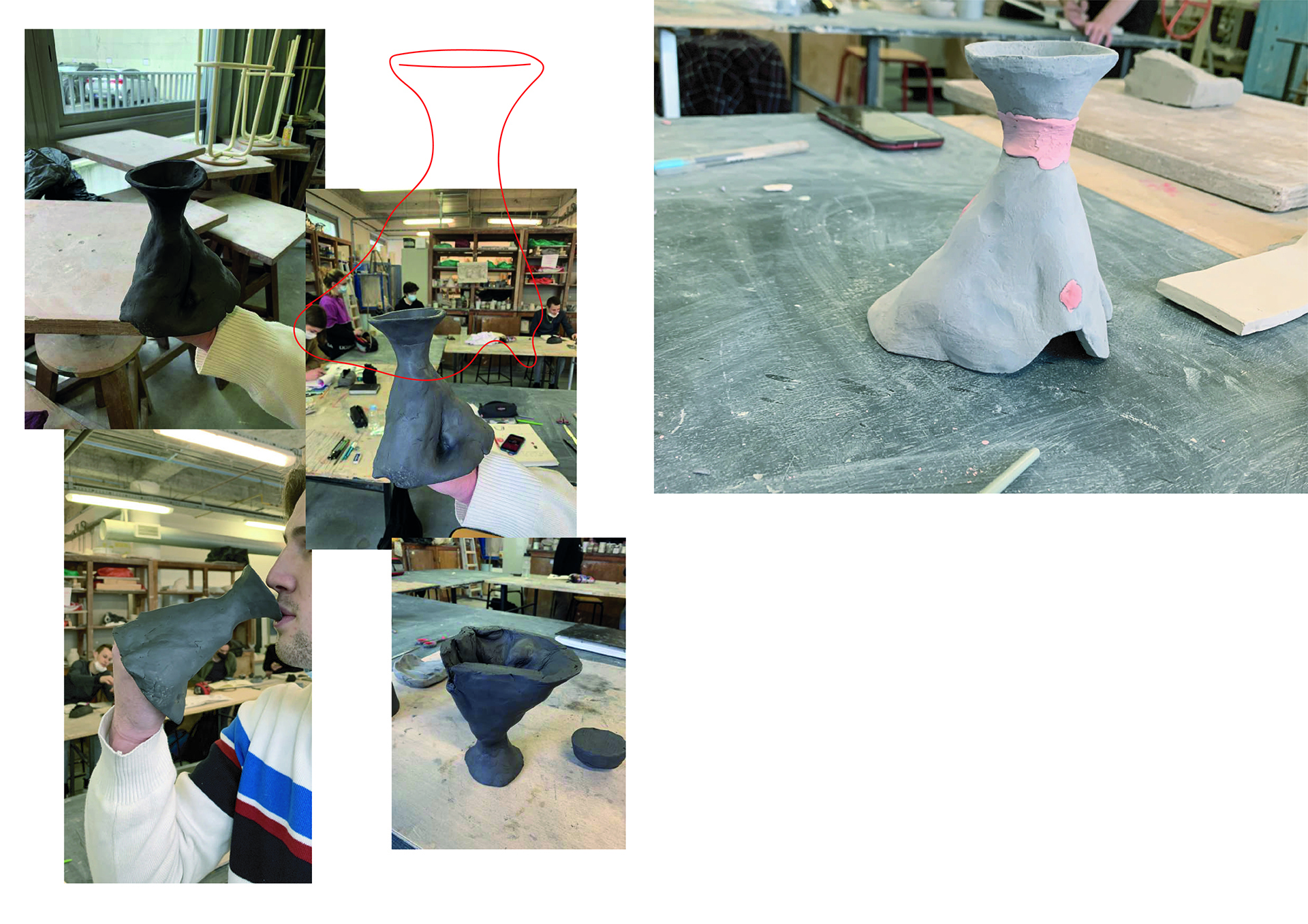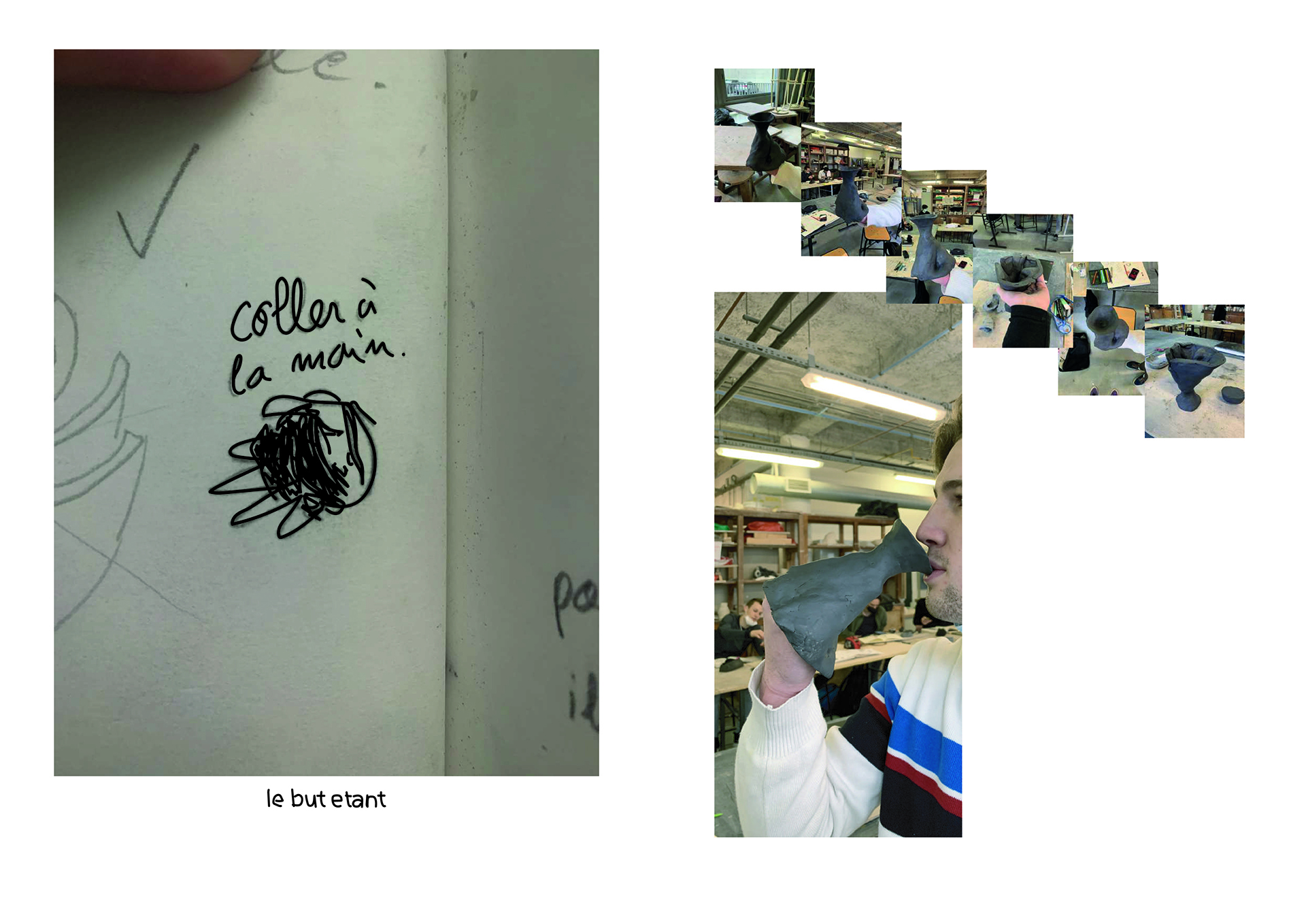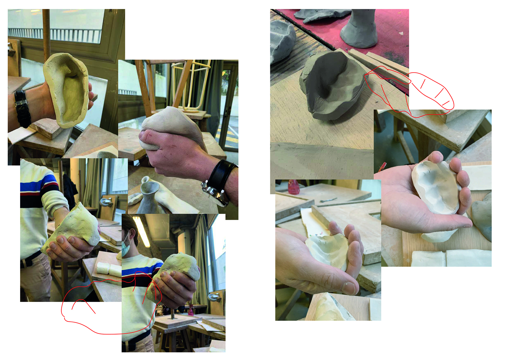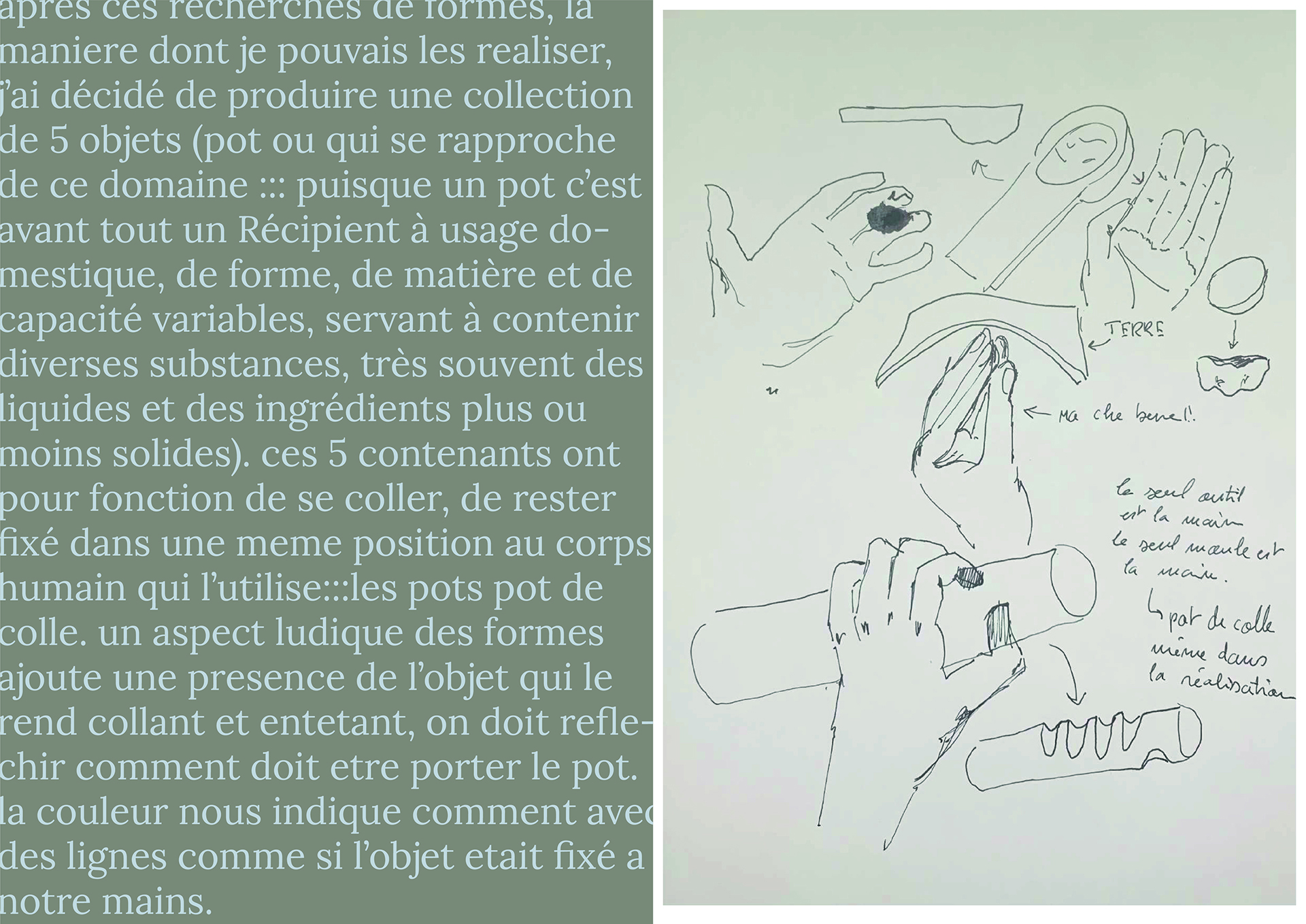 Fabriquer une série de pots répondant tous au même jeux de mot :::pot de colle. L'idée de la matière qui prend pocession et grandit autour de la main de l'homme qui l'utilise, comme s'il n'allait jamais pouvoir l'enlever. Entre un pot qui recouvre la main entière en faisant geste du che vuoi, ou le pot qui s'allonge le long du bras comme s'il voulait se cacher sous la manche. Des réponses qui rendent le pot amusant à tenir.